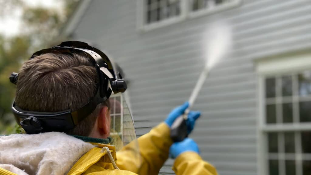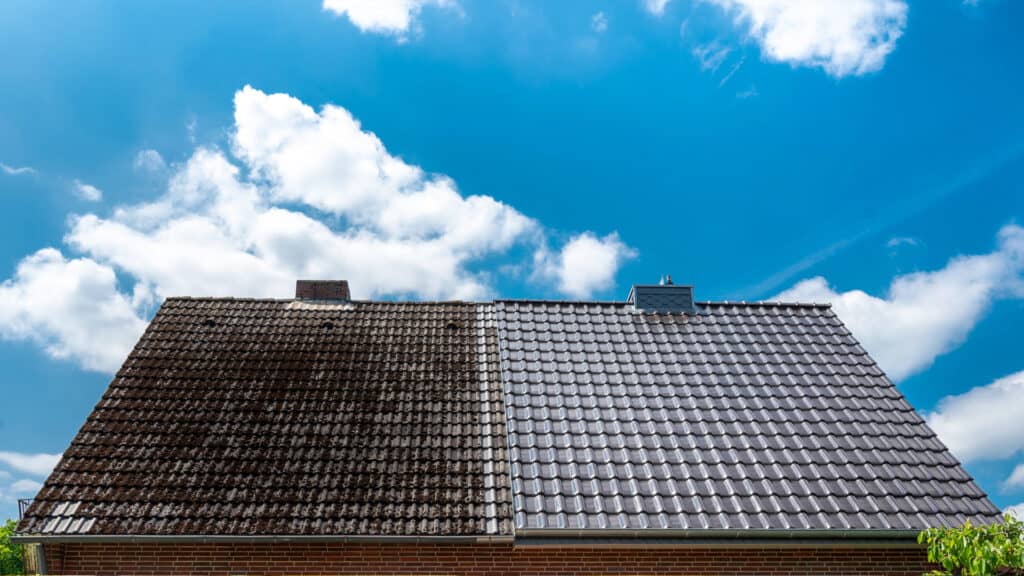 High pressure can strip shingle granules and crack tile. We don’t do that. Our roof clean uses low pressure with a roof-safe solution that clears black streaks and mildew. Most roofs look new again before we leave, and the clean often lasts 12–24 months in this climate. We protect plants and fixtures, control runoff, and rinse thoroughly.