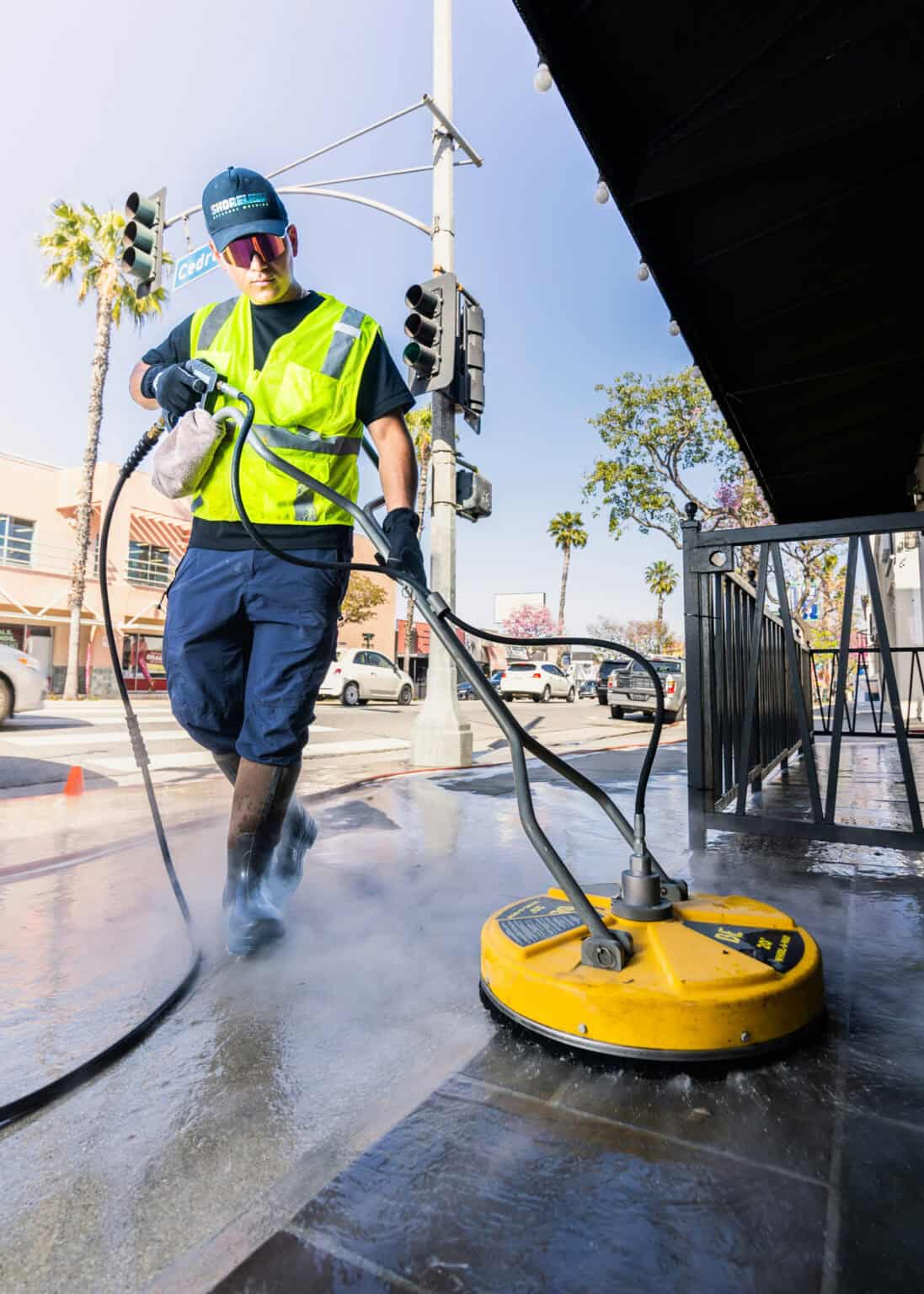 Storefronts, sidewalks, awnings, dumpsters and grease pads, parking lots and garages, pool decks, and common areas. We offer night work to avoid foot traffic and can set up quarterly or semi-annual plans so properties stay clean without reminders.